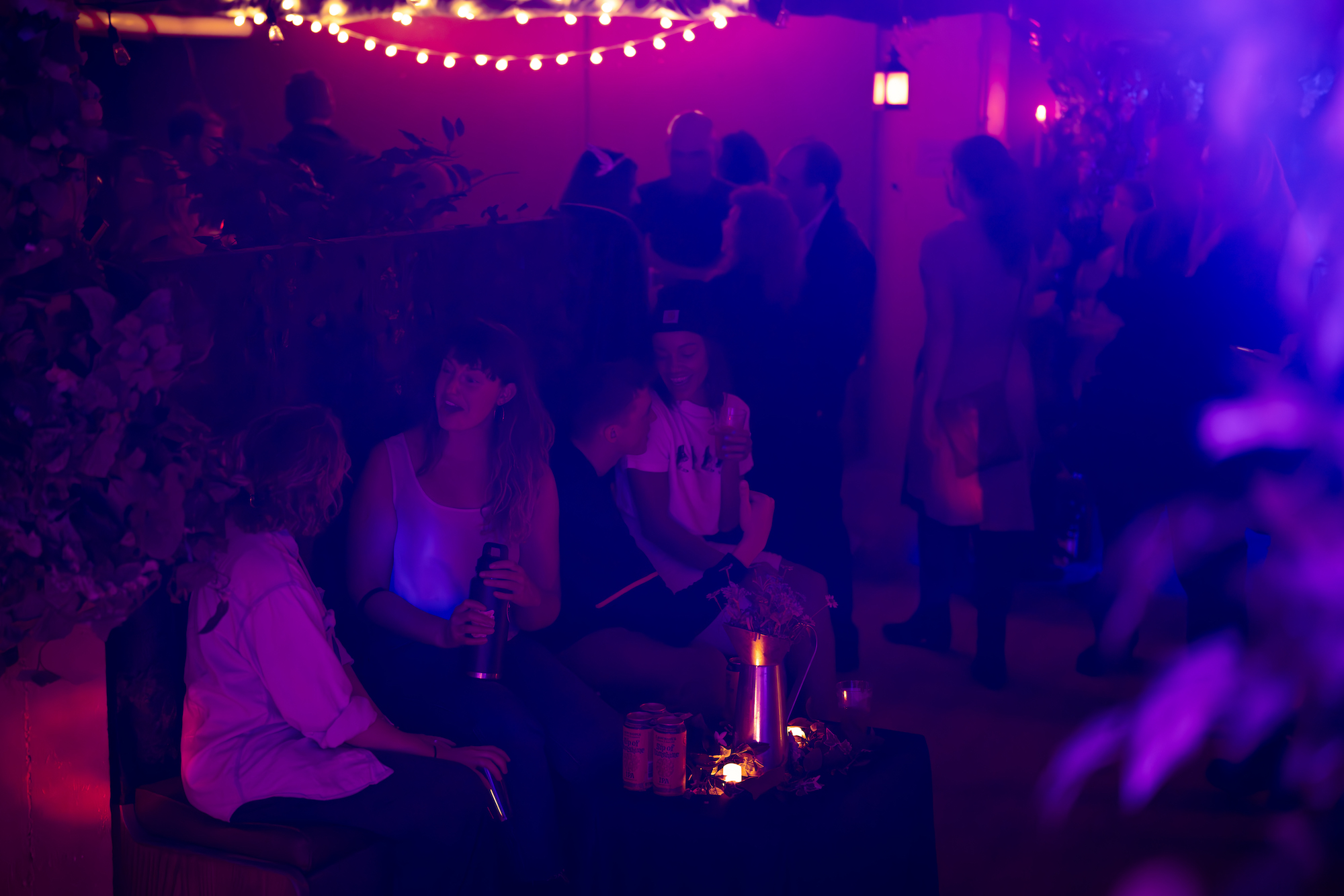 while moving through the ethereal, otherworldly sounds of Nightbloom, guests wandered among botanics and hanging lanterns, rested in a cloud nook, paused at a fountain, drew a tarot card to take home, and painted neon strokes on a black light painting wall, all bathed in soft, colorful lighting. the space felt alive with quiet magic, a living reflection of the album itself.
